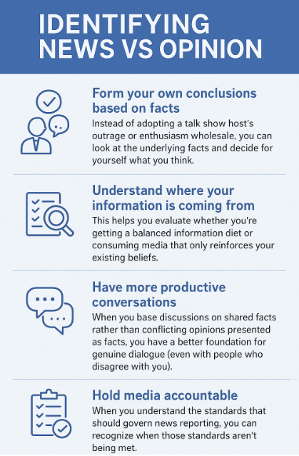 And honestly? I can’t blame my neighbor for the confusion. The line between news reporting and opinion has become so blurred that even media-savvy folks sometimes struggle to tell the difference. And don’t even get me started on how AI has further complicated things (that’s a rant for another time). If you’ve ever found yourself in a similar situation, wondering whether you just consumed facts or someone’s personal take on those facts, you’re not alone.